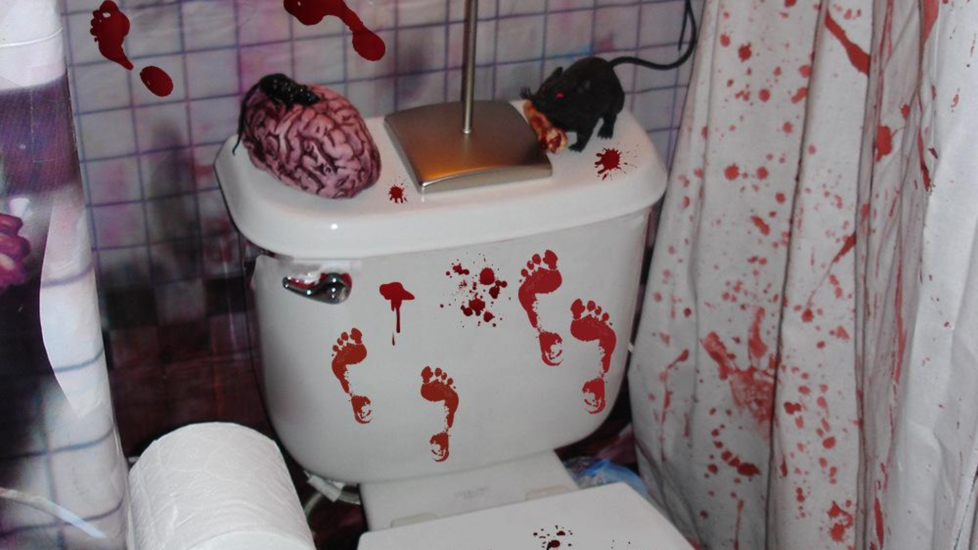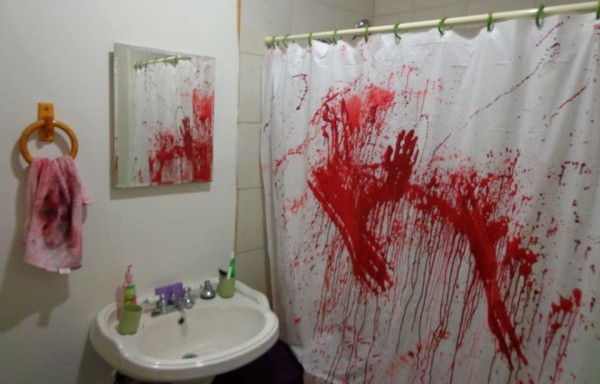 1.Sangre: algo que nunca puede faltar en una decoración de Halloween es la sangre, ya que es uno de los elementos que más asusta. Existen numerosos métodos para llenar tu baño de sangre, puedes hacerlo con sangre artificial o con vinilos en forma de huellas de manos y pies ensangrentadas, o manchas de líquido rojo.