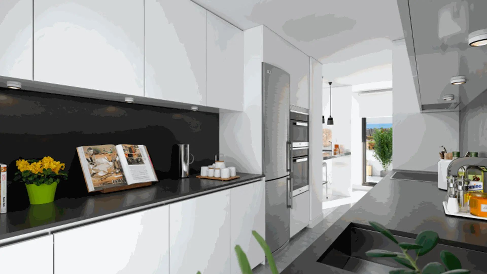 En todas las viviendas las cocinas se encuentran amuebladas con horno y microondas enclaustrado, los dormitorios van equipados con armarios empotrados y salida a las terrazas. Además, se entregan con plaza de garaje y trastero.