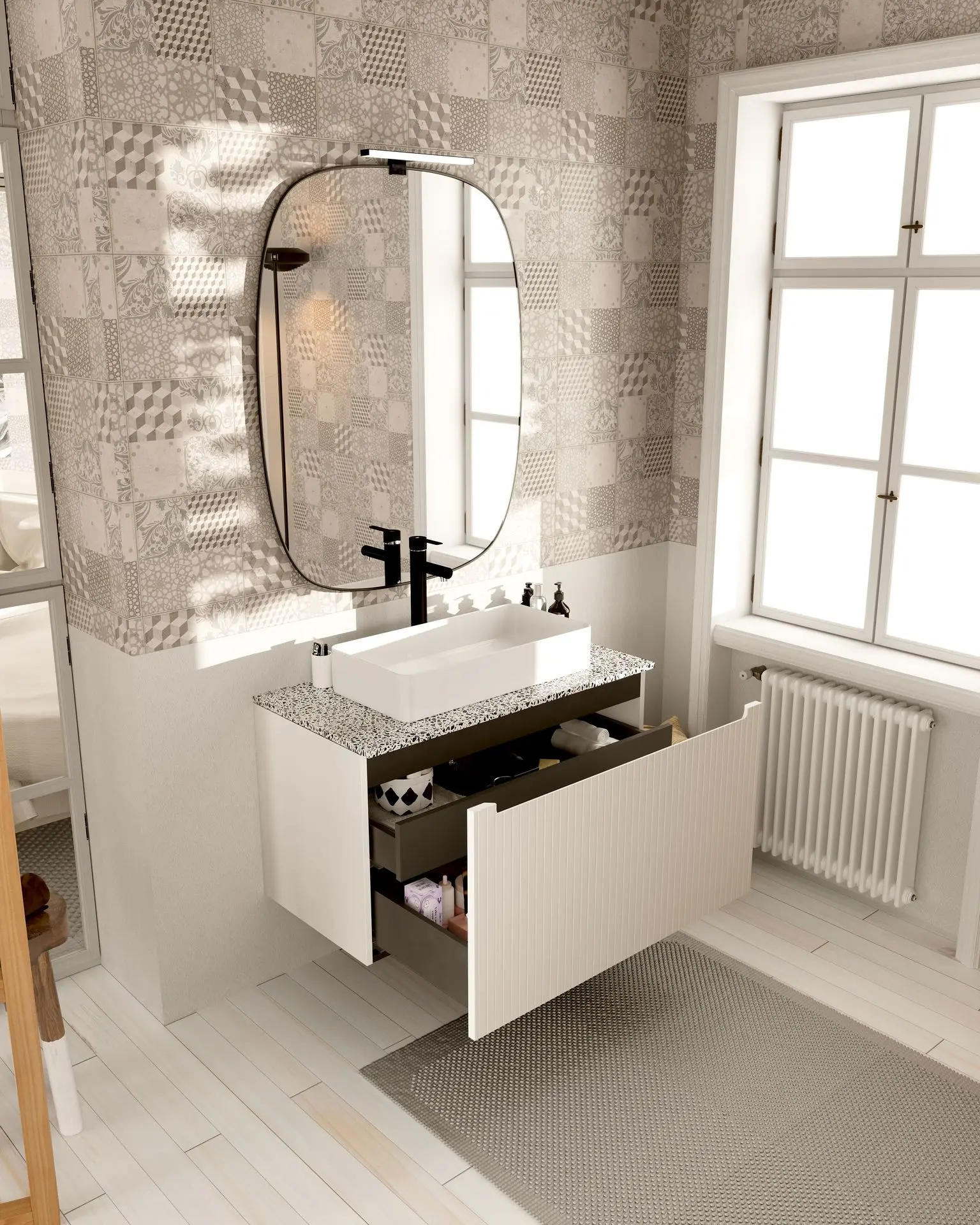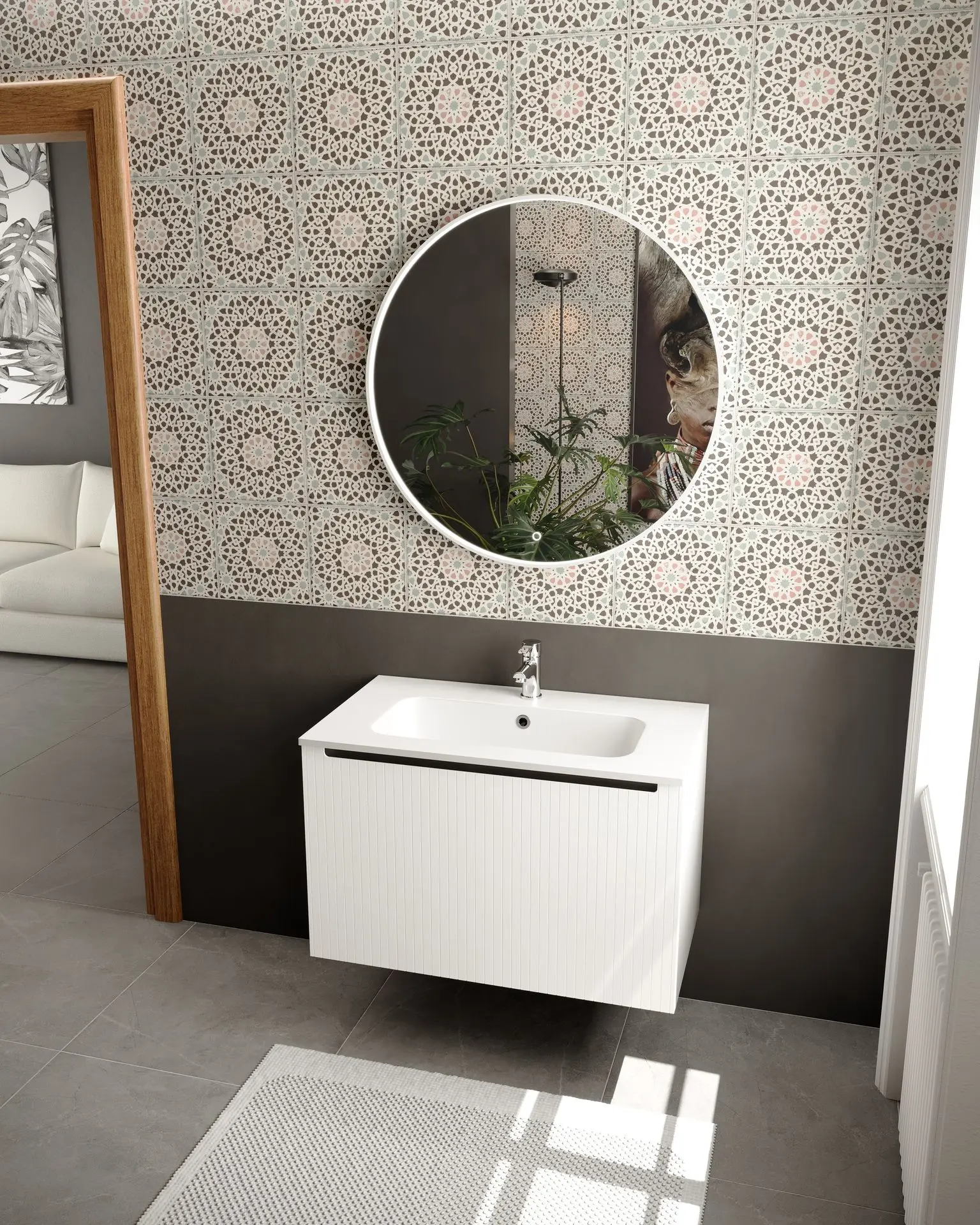 Inspirado en la palillería clásica, el Mueble Foix fusiona tradición y modernidad en un diseño que emana elegancia y energía vanguardista. Disponible en acabado blanco, su frontal alistonado imita la textura de la madera, añadiendo una riqueza visual y táctil que aporta carácter y profundidad al conjunto. Compuesto exteriormente por un solo cajón y de instalación suspendida.