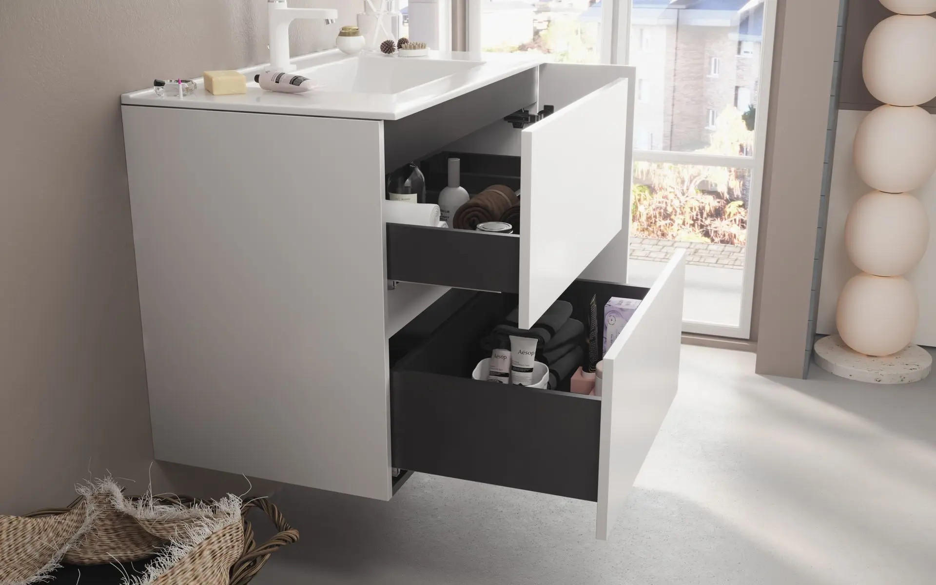 Diseñado para aquellos que priorizan la funcionalidad sin sacrificar el estilo, el Mueble Alier, de instalación suspendida, combina practicidad y estética en un diseño limpio y moderno. Con dos cajones amplios y una puerta que se abre mediante un sistema push, Alier optimiza el almacenamiento manteniendo una apariencia minimalista.