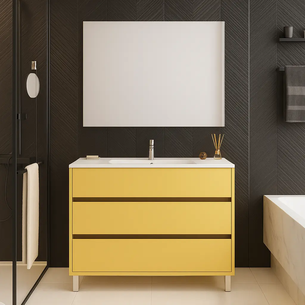 - Grifería en latón: su acabado dorado potencia la calidez del amarillo y añade un guiño lujoso sin estridencias.